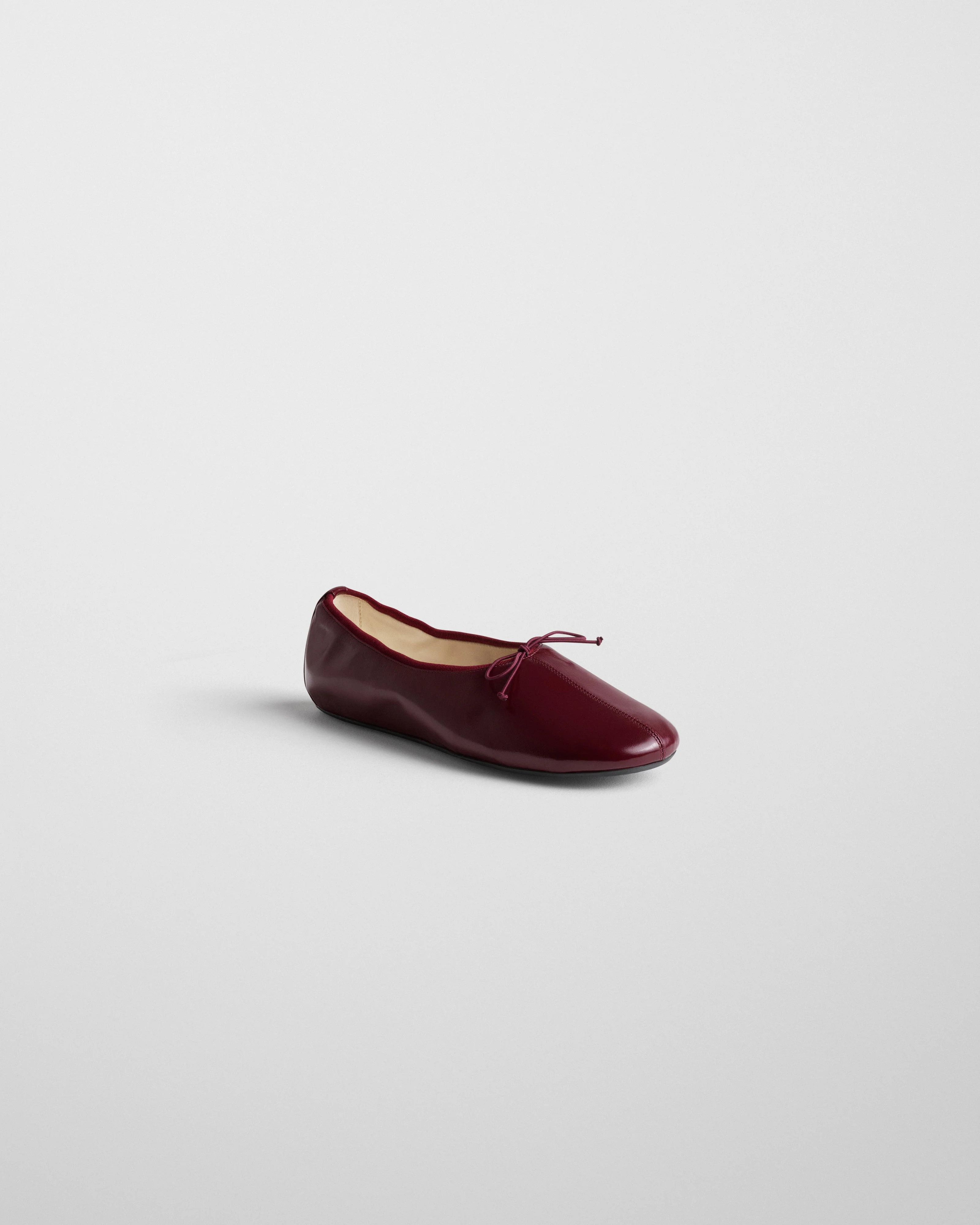 Flat pump in merlot leather with a glossy sheen. Cut high on the foot with a rounded toe. Rubber sole and in-built 10 mm wedge for support and comfort. Grosgrain trim and tie.