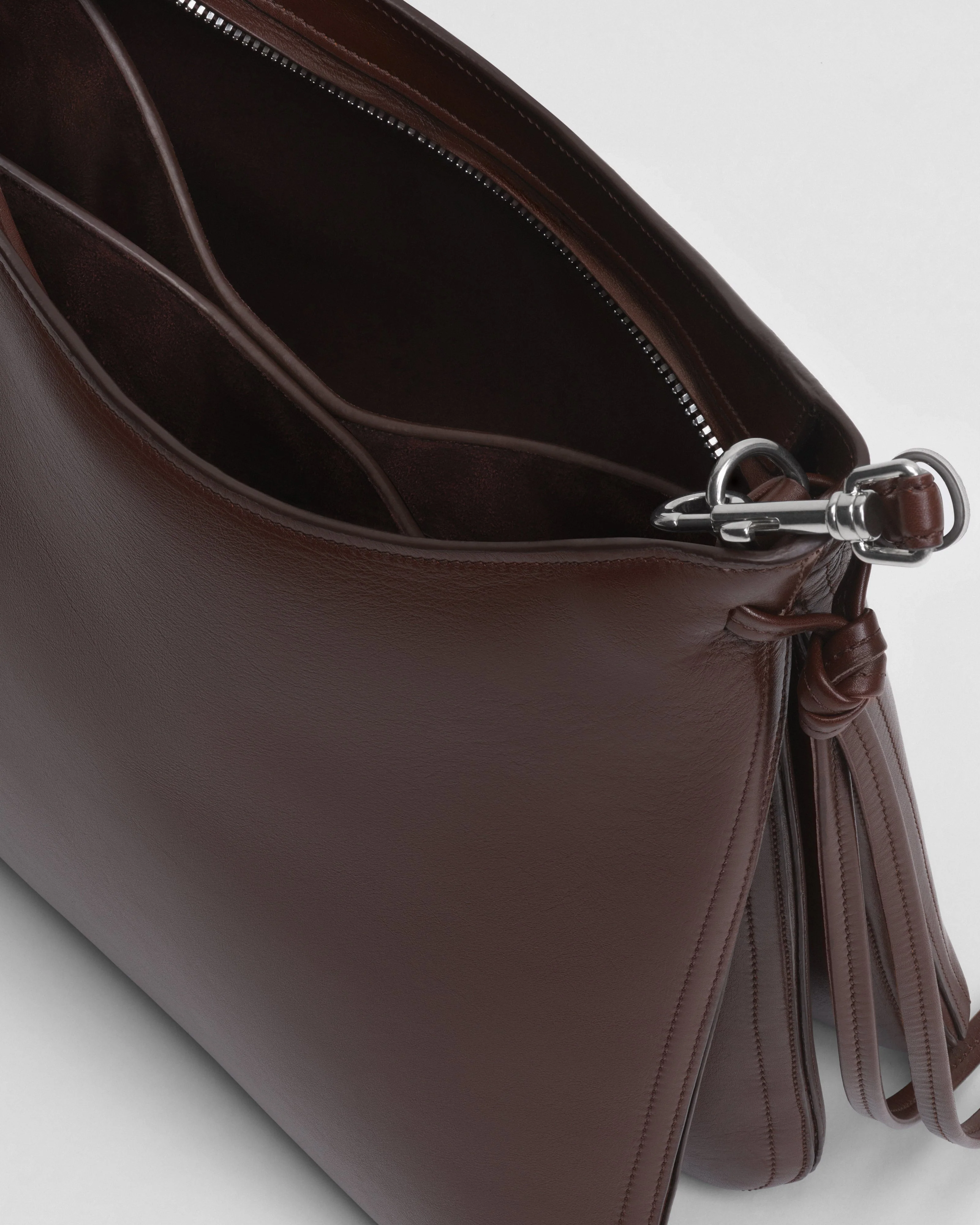 Gig bag in cognac leather with tonal suede lining, tonal stitching, silver tone hardware, leather tie detail and zip closure. The bag has three softly structured compartments and an adjustable strap, which allows it to be worn crossbody or over the shoulder.