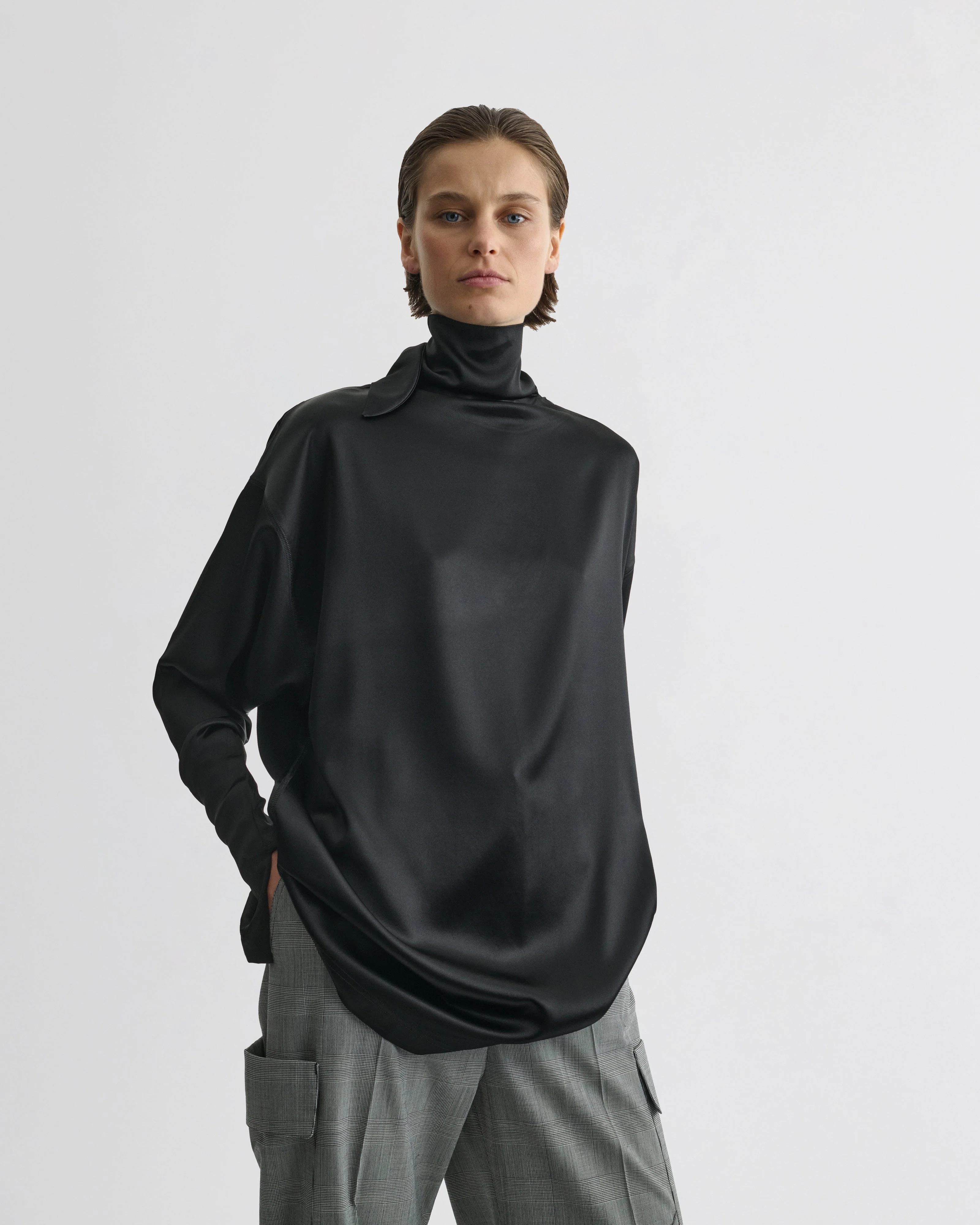 Top in black stretch silk satin with knot detail. Fluid and generously cut in the body with sleeves that narrow at the wrist, the liquid effect is amplified by a sheen finish. The high neck fastens in a tie at the back.