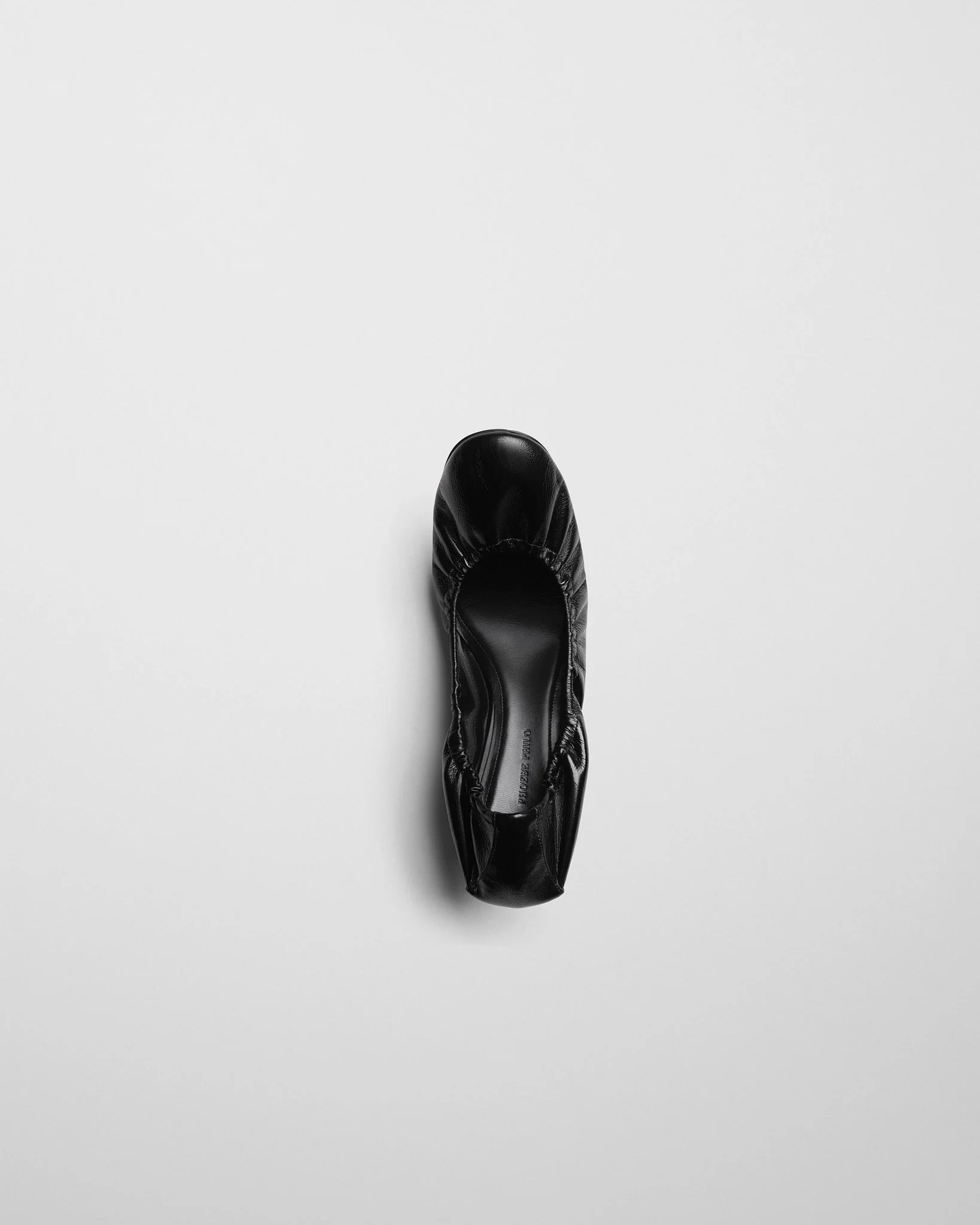 Pucker pump in shiny black leather with a rounded toe and elasticated topline. The shoe has a leather sole and a 45 mm indented sharp heel.