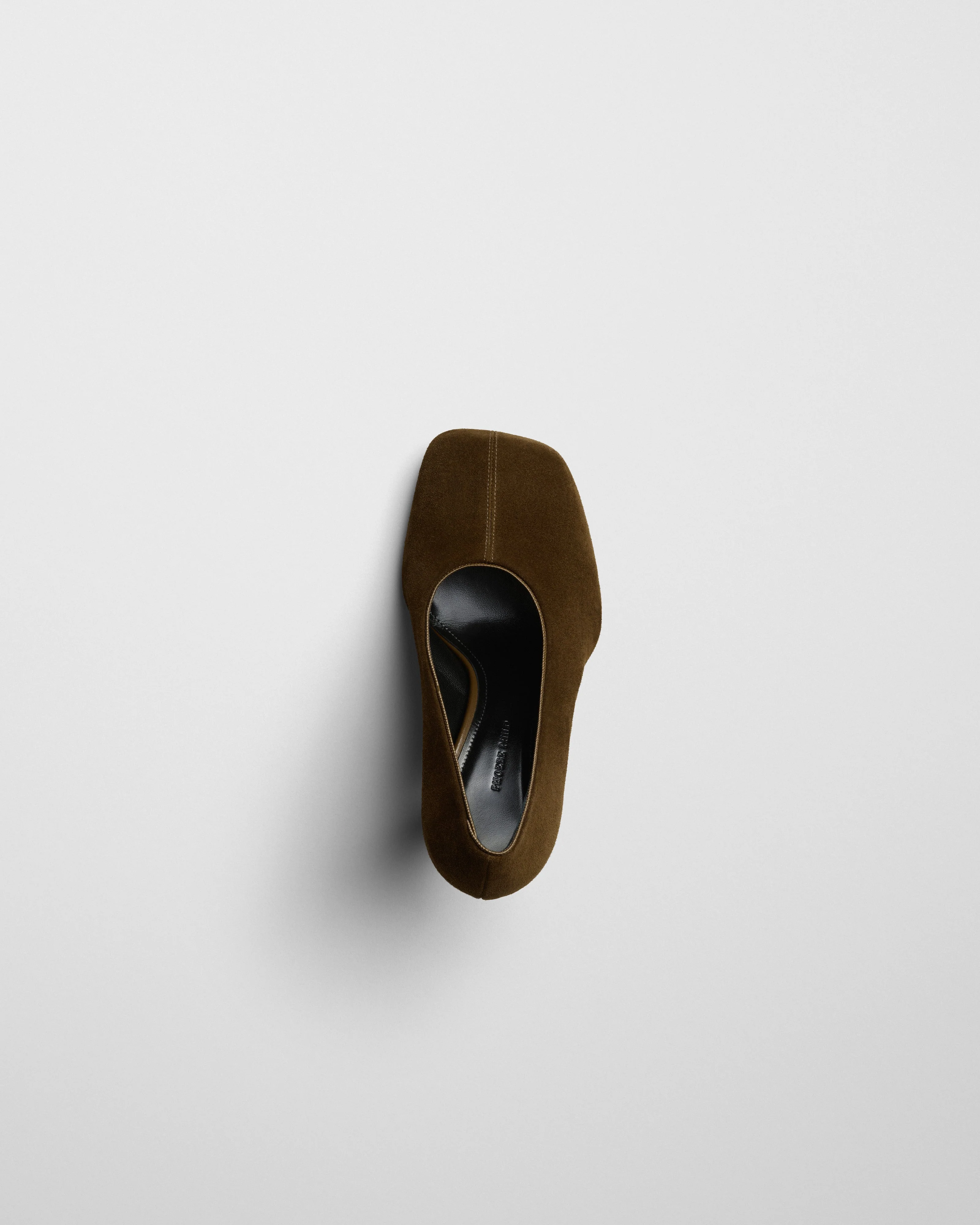 Soft pump in dark khaki suede with an 90mm heel. The pump has a distinct wide front, short square toe, island sole and lightly padded fixed insole.