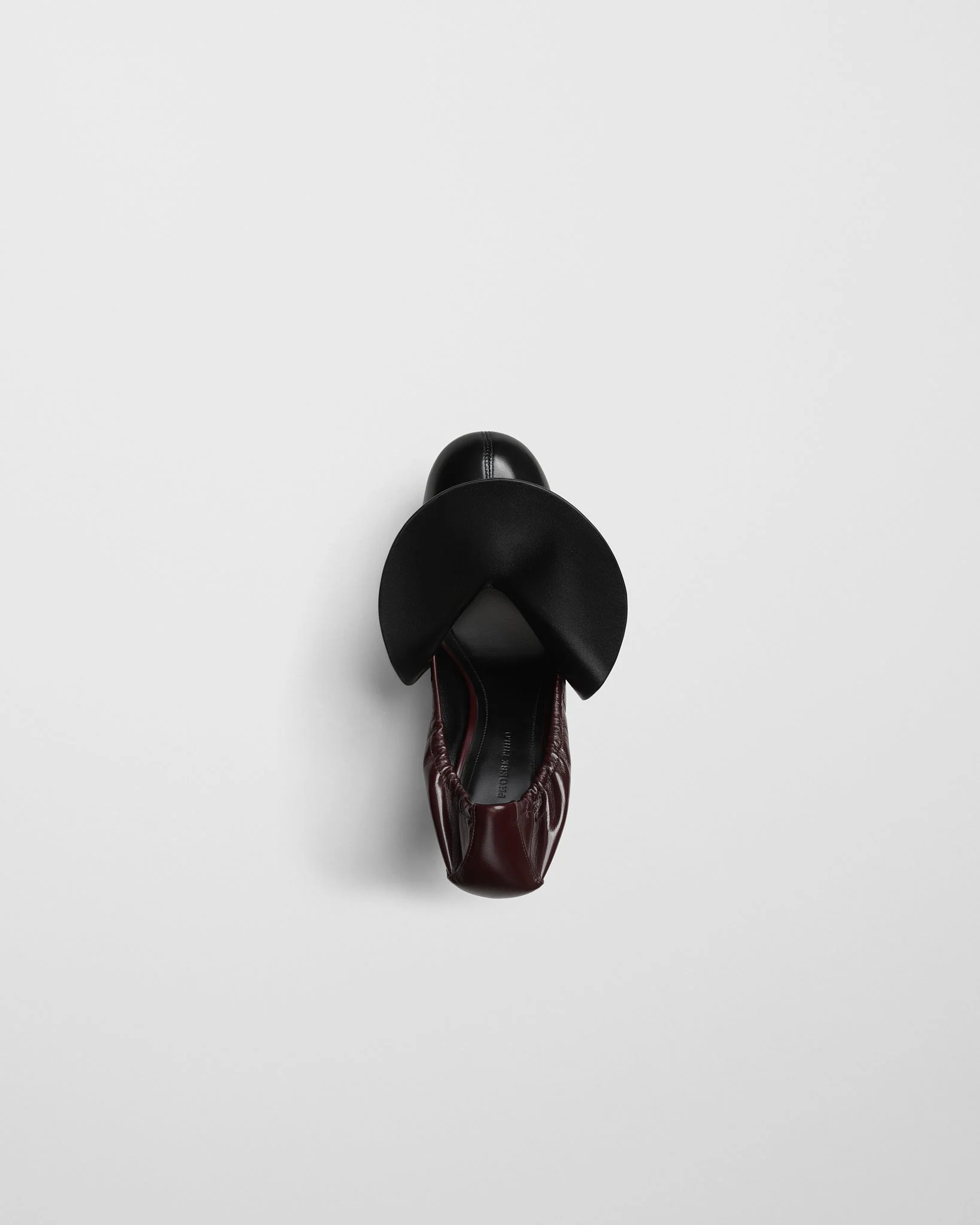 Stopper pump in oxblood leather with sculpted fold down detail in black. The pump has a rounded toe and gathered topline. 100 mm stacked heel.